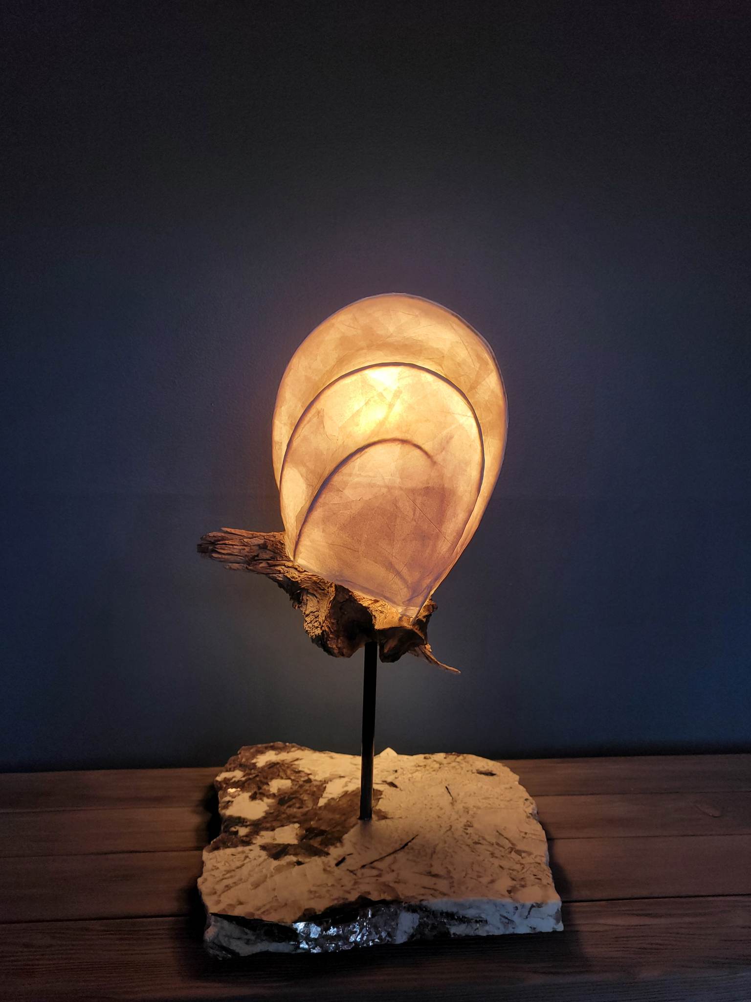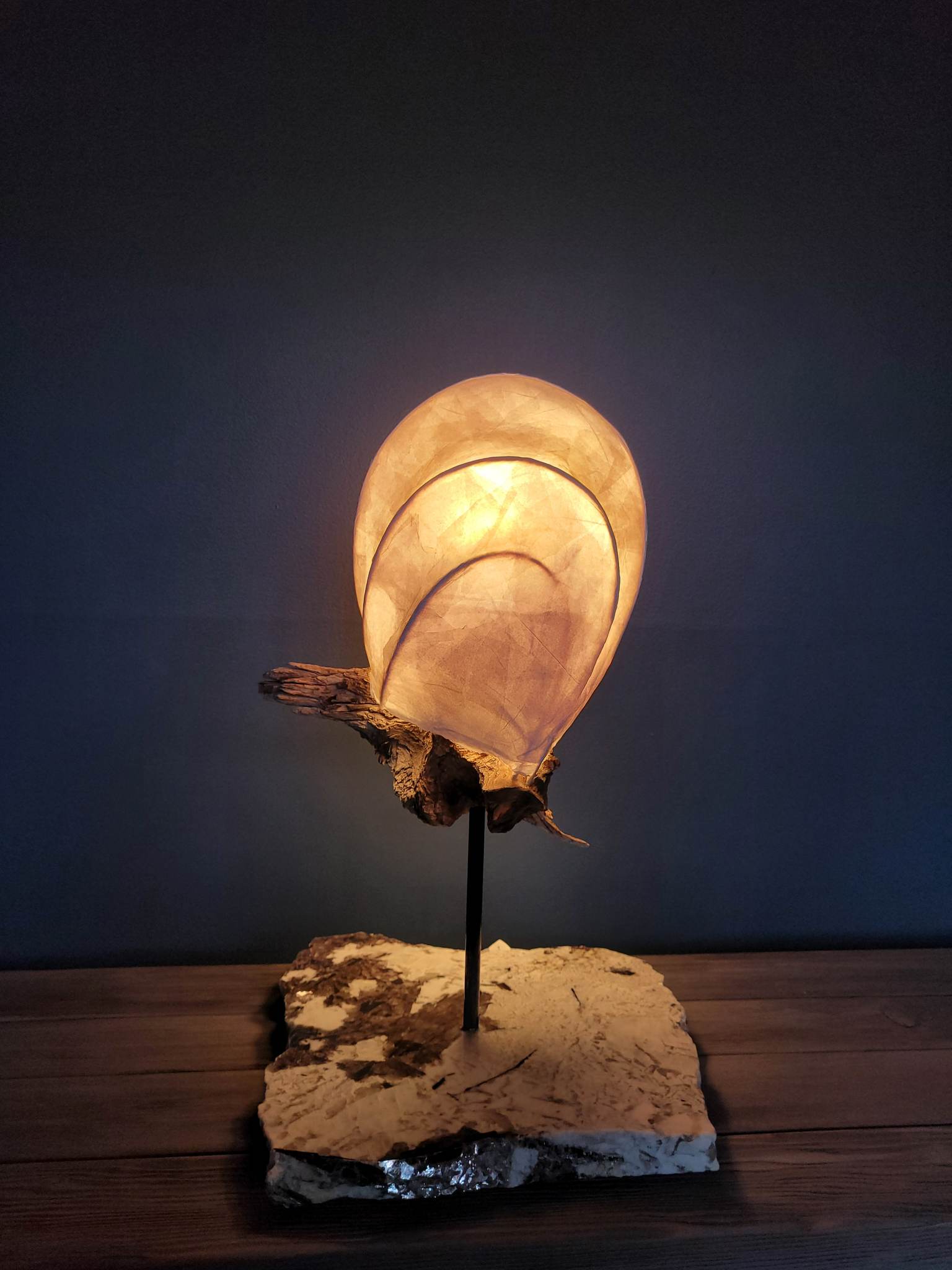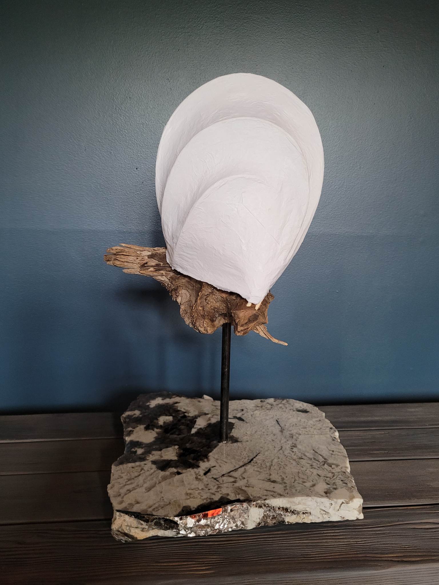 Each Spring, I head out and harvest these yummy shoots. This piece was reminiscent of these fiddleheads. It sits on a base of Royal White granite and driftwood with 10 layers of tissue paper on it.
